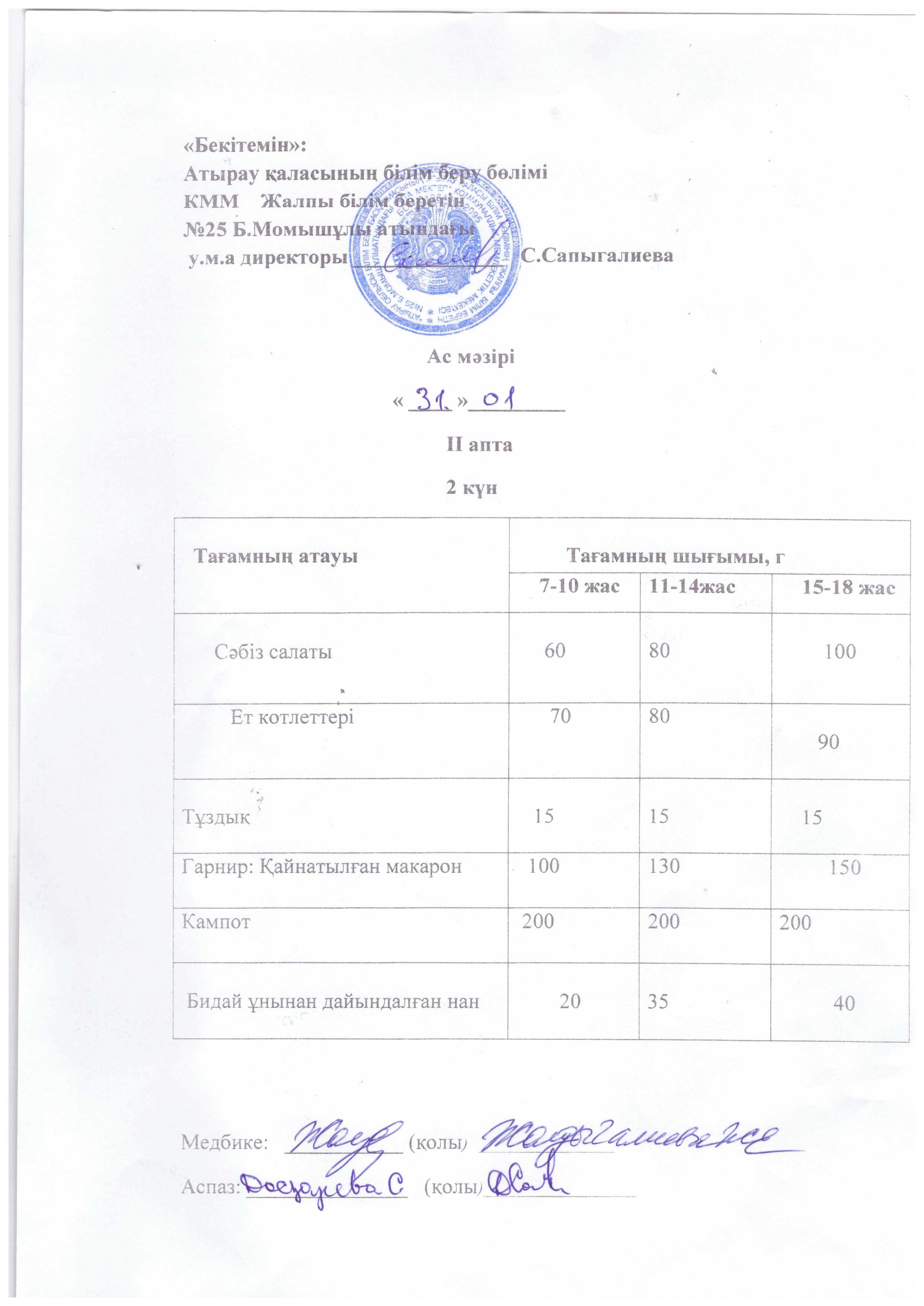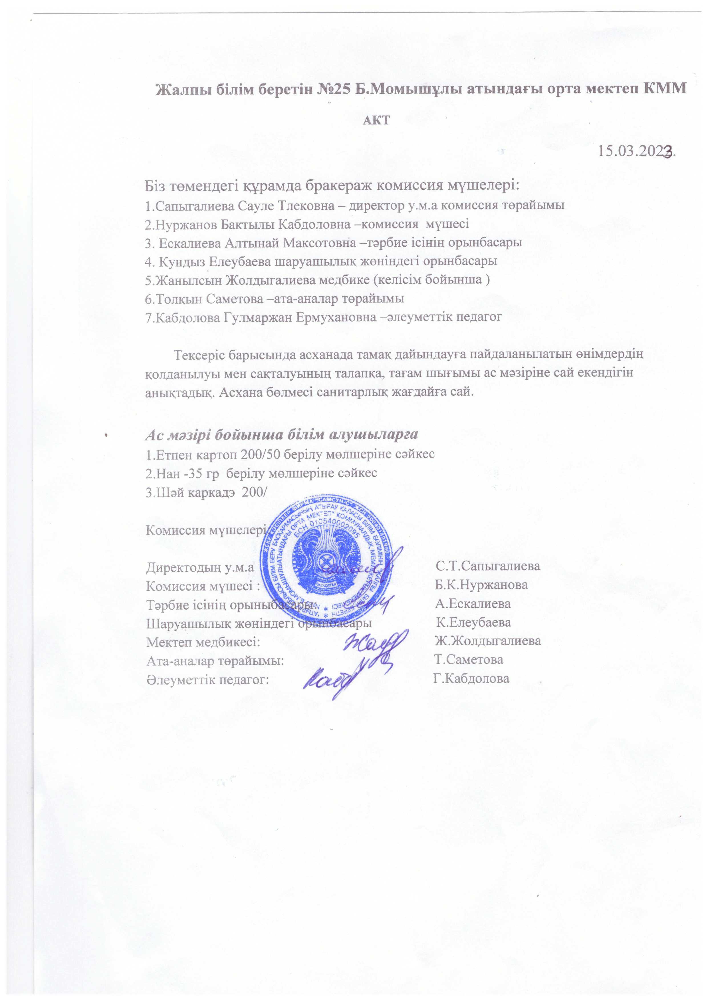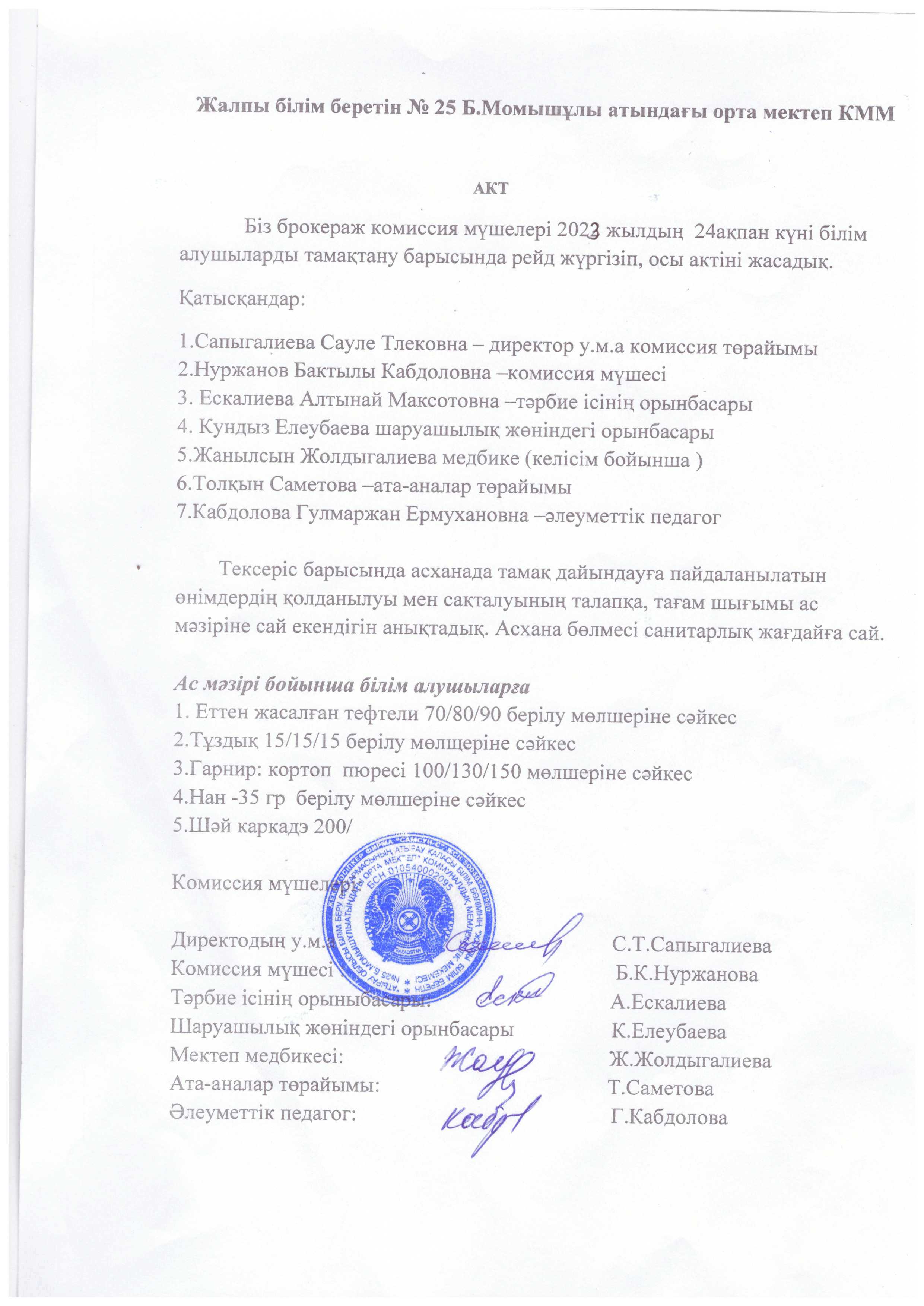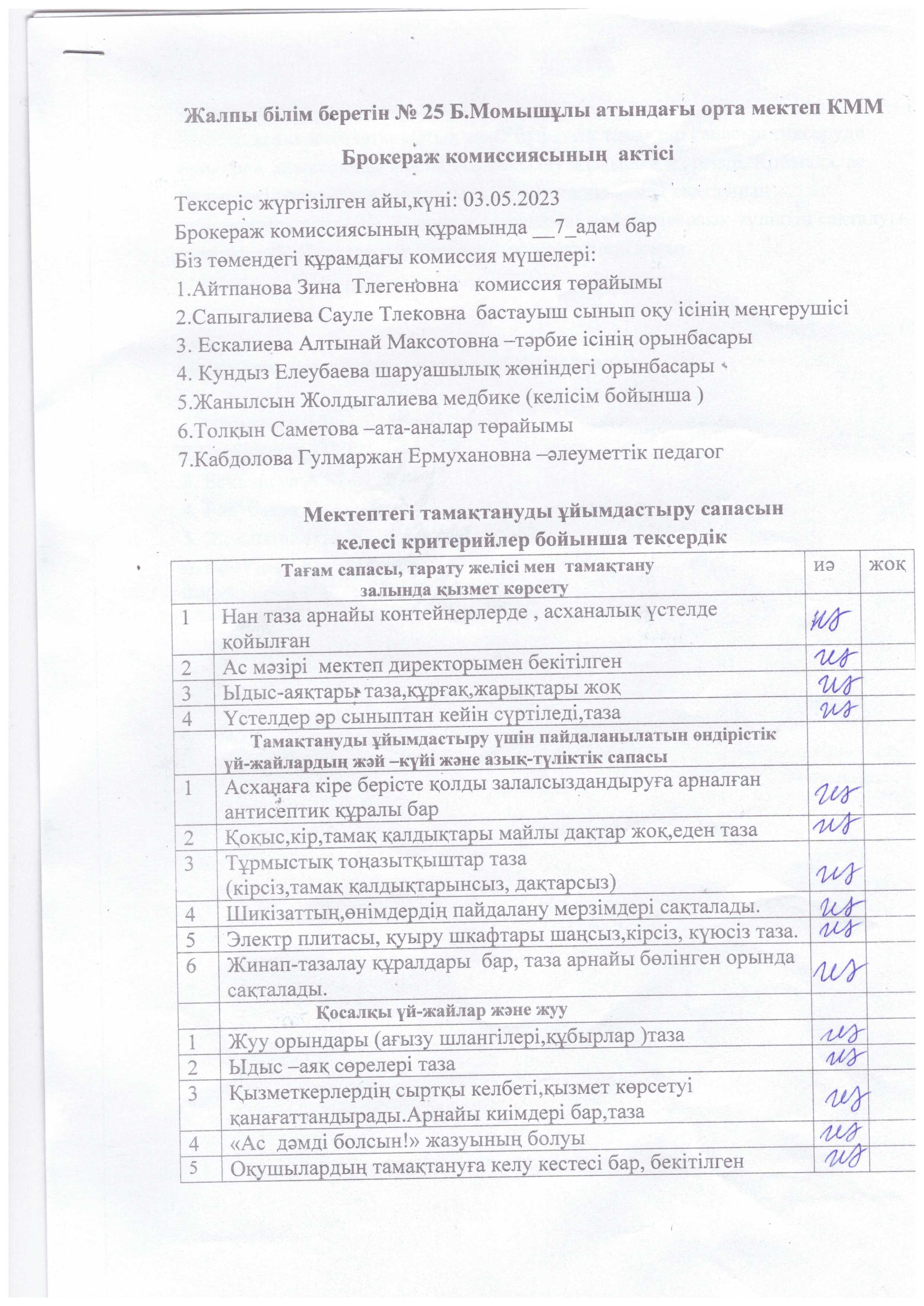Жалпы білім беретін №25 Б.Момышұлы атындағы орта мектебі КММ асханасында тексеру жүргізілді. Асхананың ас әзірлейтін блоктың, қойманың, аспазшының санитарлық жағдайы, пайдаланатын ыдыстардың қолдану сапасы тексерілді. Асхананың санитарлық жағдайы жақсы, еден, терезеалды, үстел үсті сүртілген, терезе ашылып, желдетілген. Асханадағы құрал - жабдықтар дайын, таза әр ыдыстың орны бар. Азпазшының халаты, бас киімі бар. Асхана оқушыларды тамақтандыруға дайын. Дәрігерлік санитарлық тексерістен өткен. Ас дайындайтын блоктың санитарлық жағдайы талапқа сай, арнайы мөлшерленген. Бекітілген ас мәзірі бар. Қорытынды: асхананың санитарлық жағдайы қанағаттанарлық, талаптарға сай.