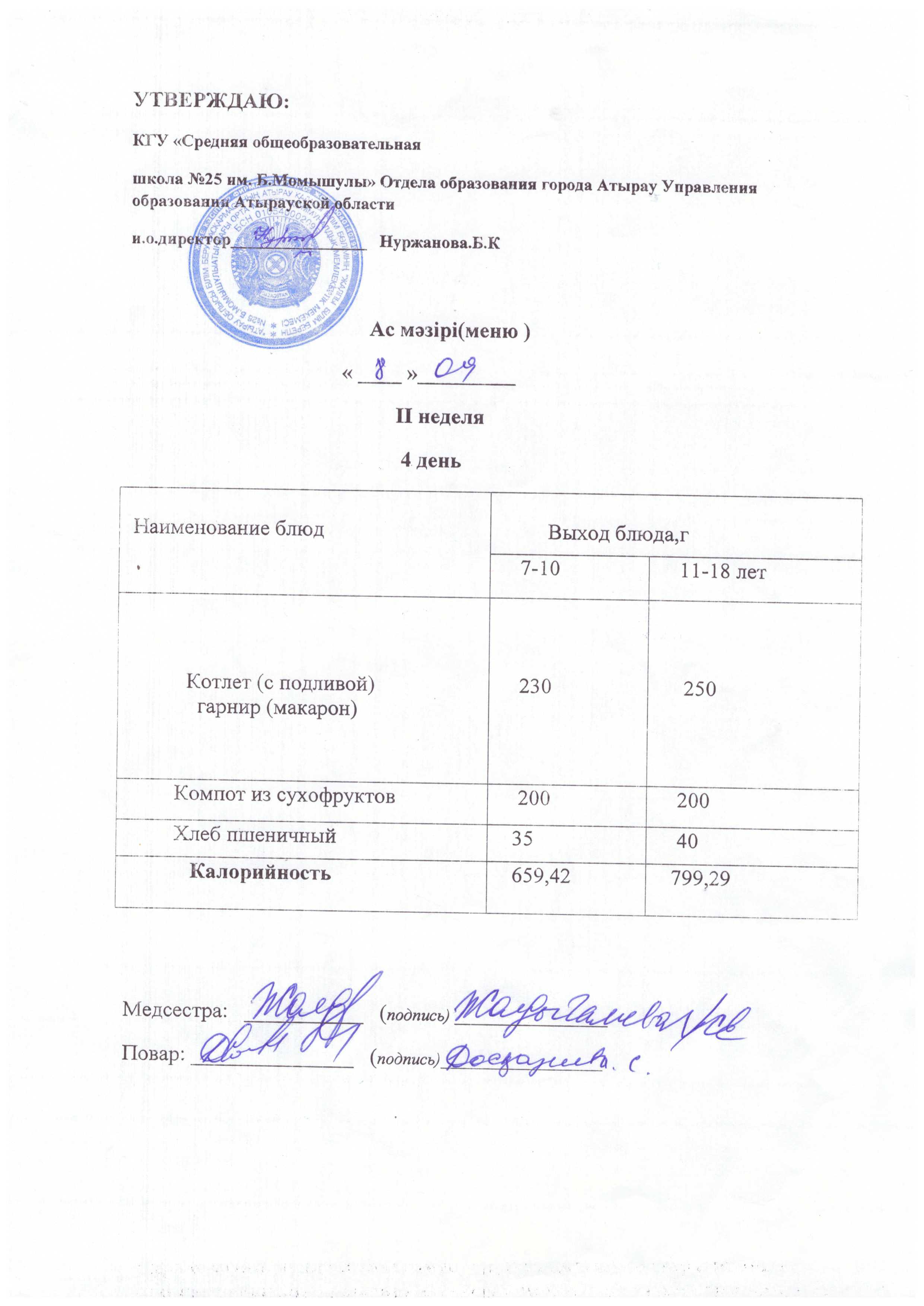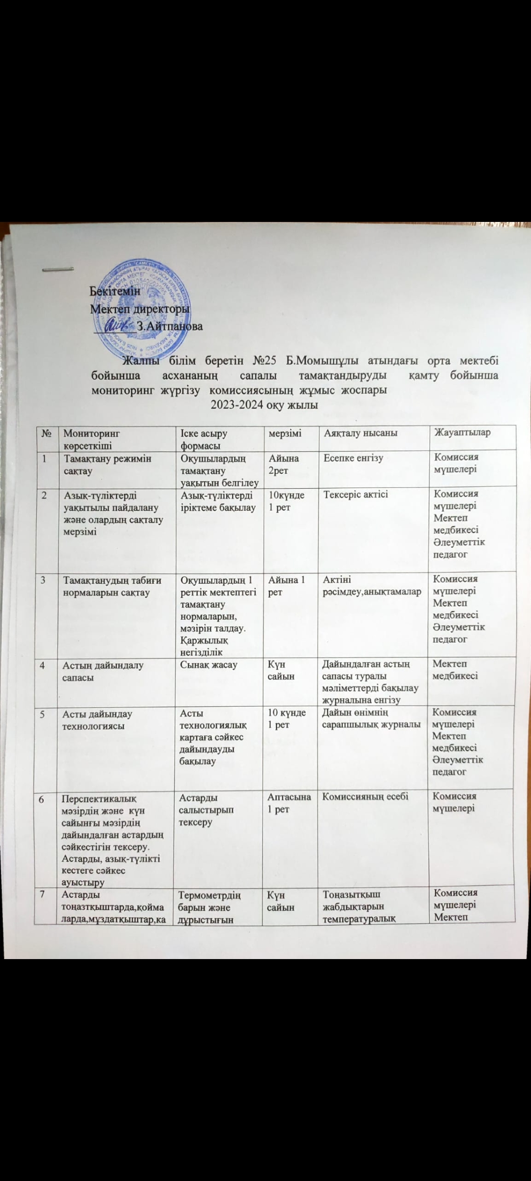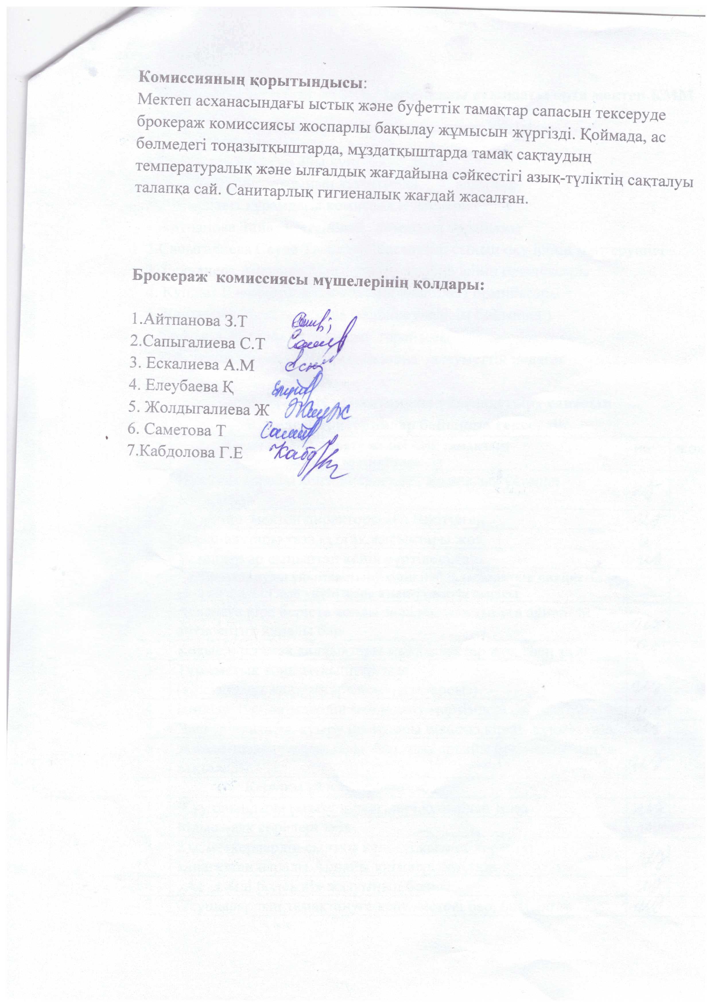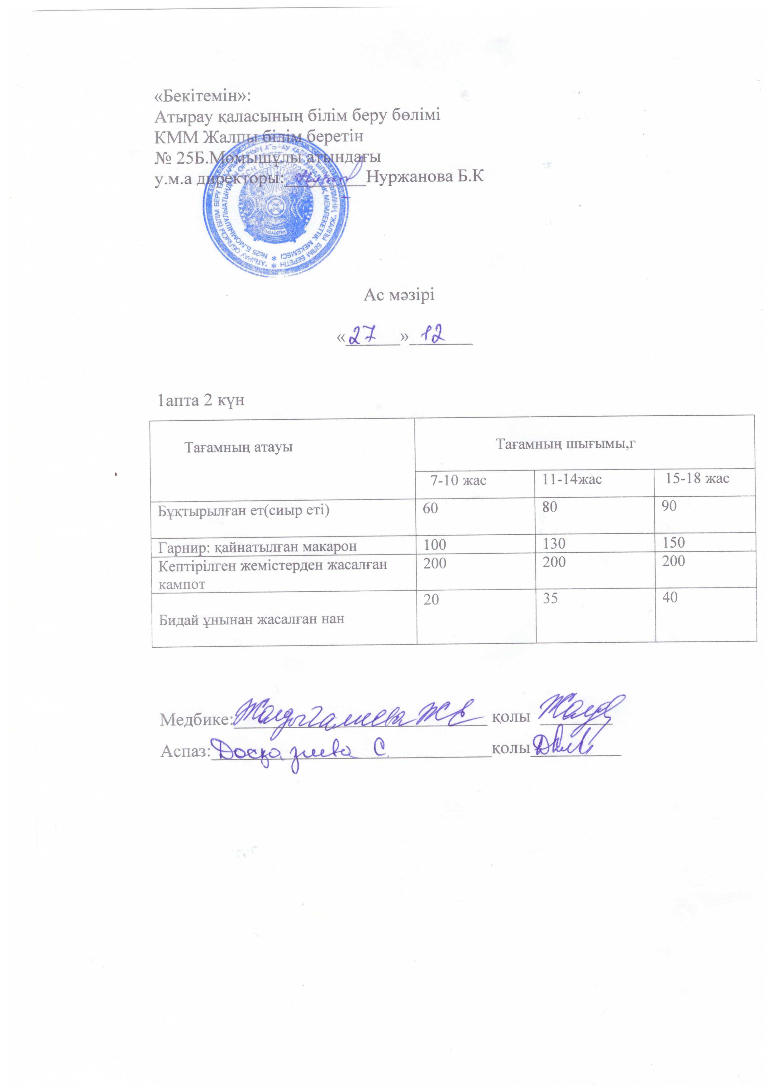 Жалпы білім беретін №25 Б.Момышұлы атындағы орта мектебі КММ асханасында тексеру жүргізілді. Асхананың ас әзірлейтін блоктың, қойманың, аспазшының санитарлық жағдайы, пайдаланатын ыдыстардың қолдану сапасы тексерілді. Асхананың санитарлық жағдайы жақсы, еден, терезеалды, үстел үсті сүртілген, терезе ашылып, желдетілген. Асханадағы құрал - жабдықтар дайын, таза әр ыдыстың орны бар. Азпазшының халаты, бас киімі бар. Асхана оқушыларды тамақтандыруға дайын. Дәрігерлік санитарлық тексерістен өткен. Ас дайындайтын блоктың санитарлық жағдайы талапқа сай, арнайы мөлшерленген. Бекітілген ас мәзірі бар. Қорытынды: асхананың санитарлық жағдайы қанағаттанарлық, талаптарға сай.