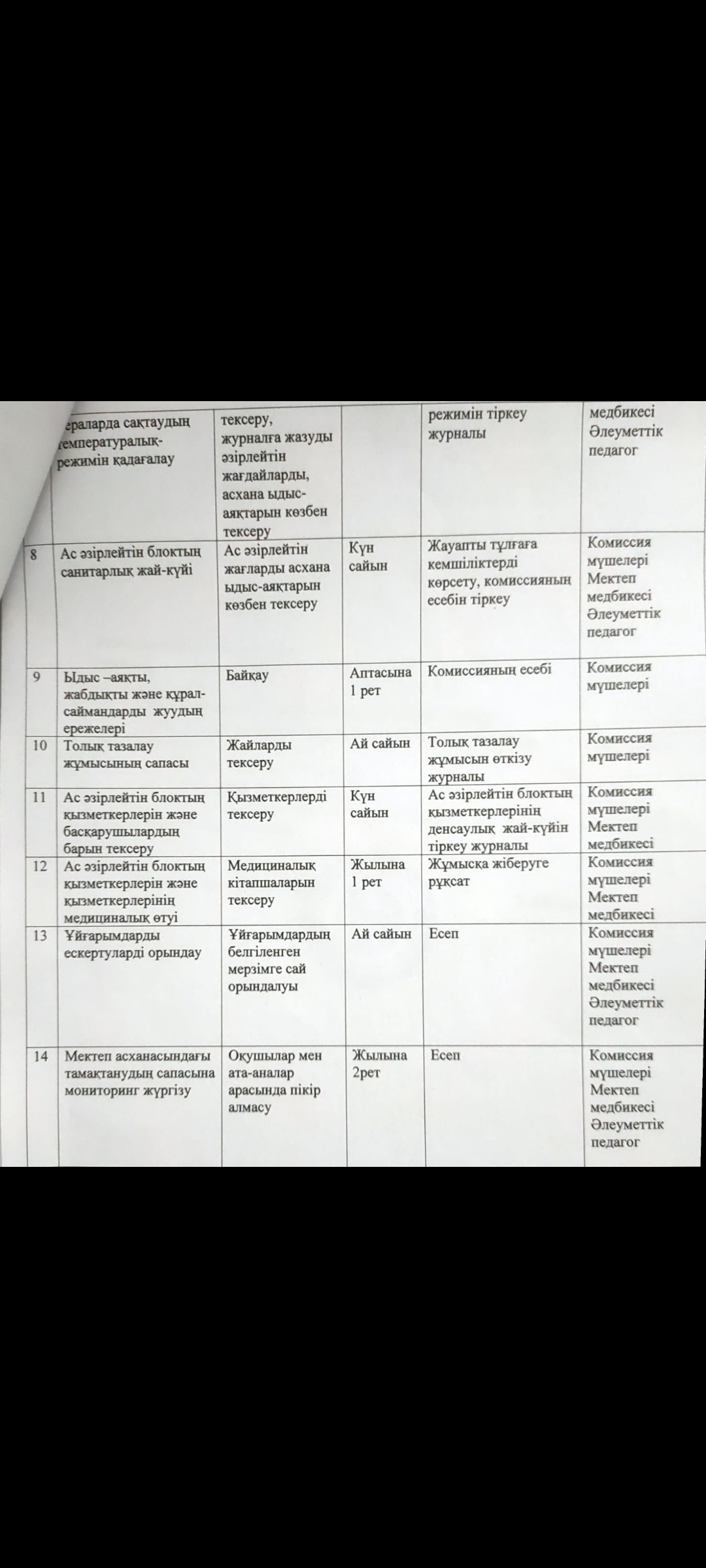 Әрбір мектепте балалардың тамақтандыруына бақылау жөніндегі комиссия жұмыс жасайды. Комиссияны мектептің директоры басқарады, құрамына мектеп медбикесі, педагогтар, ата-аналар комитетінің мүшелері, қамқоршылар кеңесі кіреді.