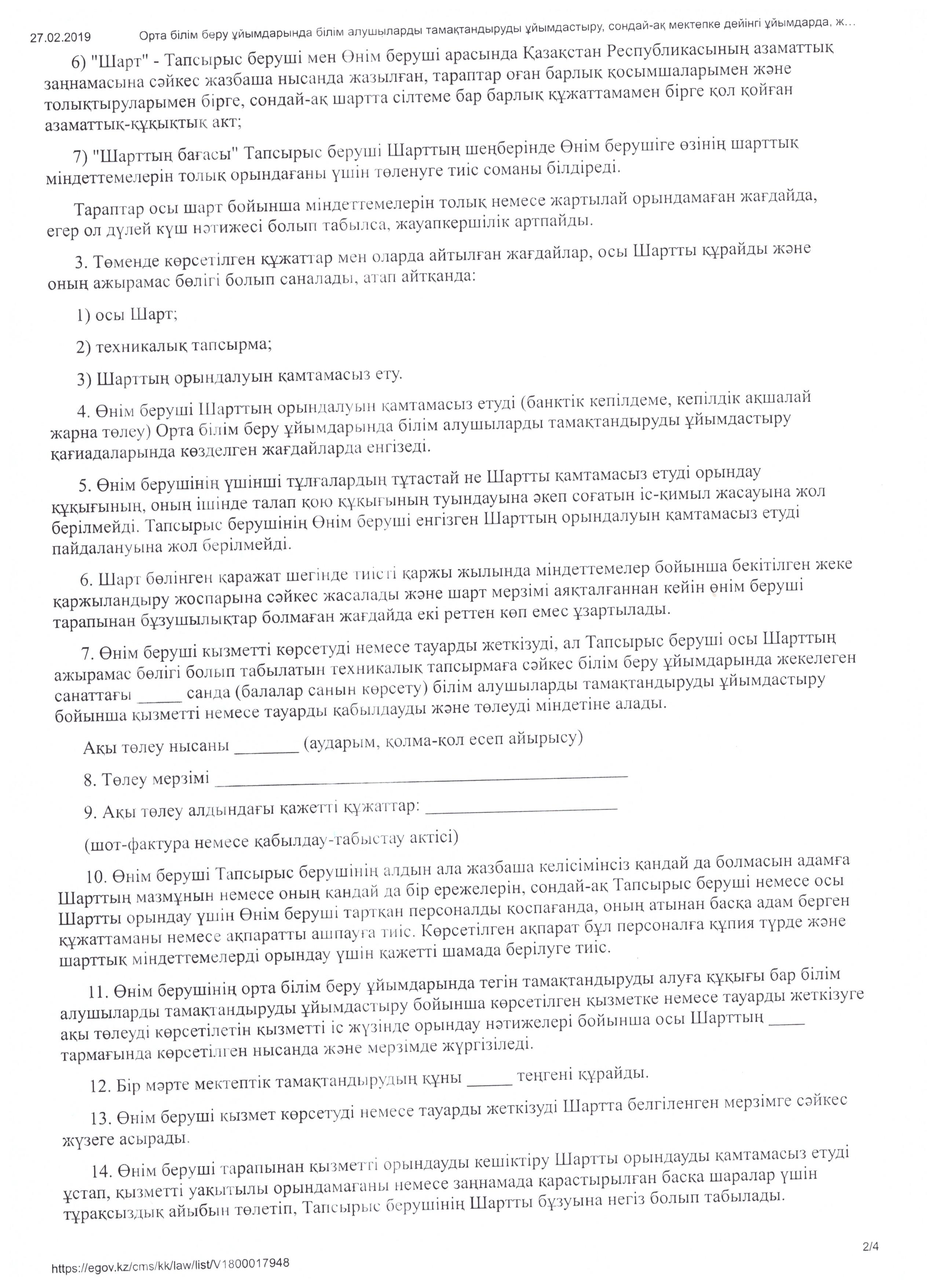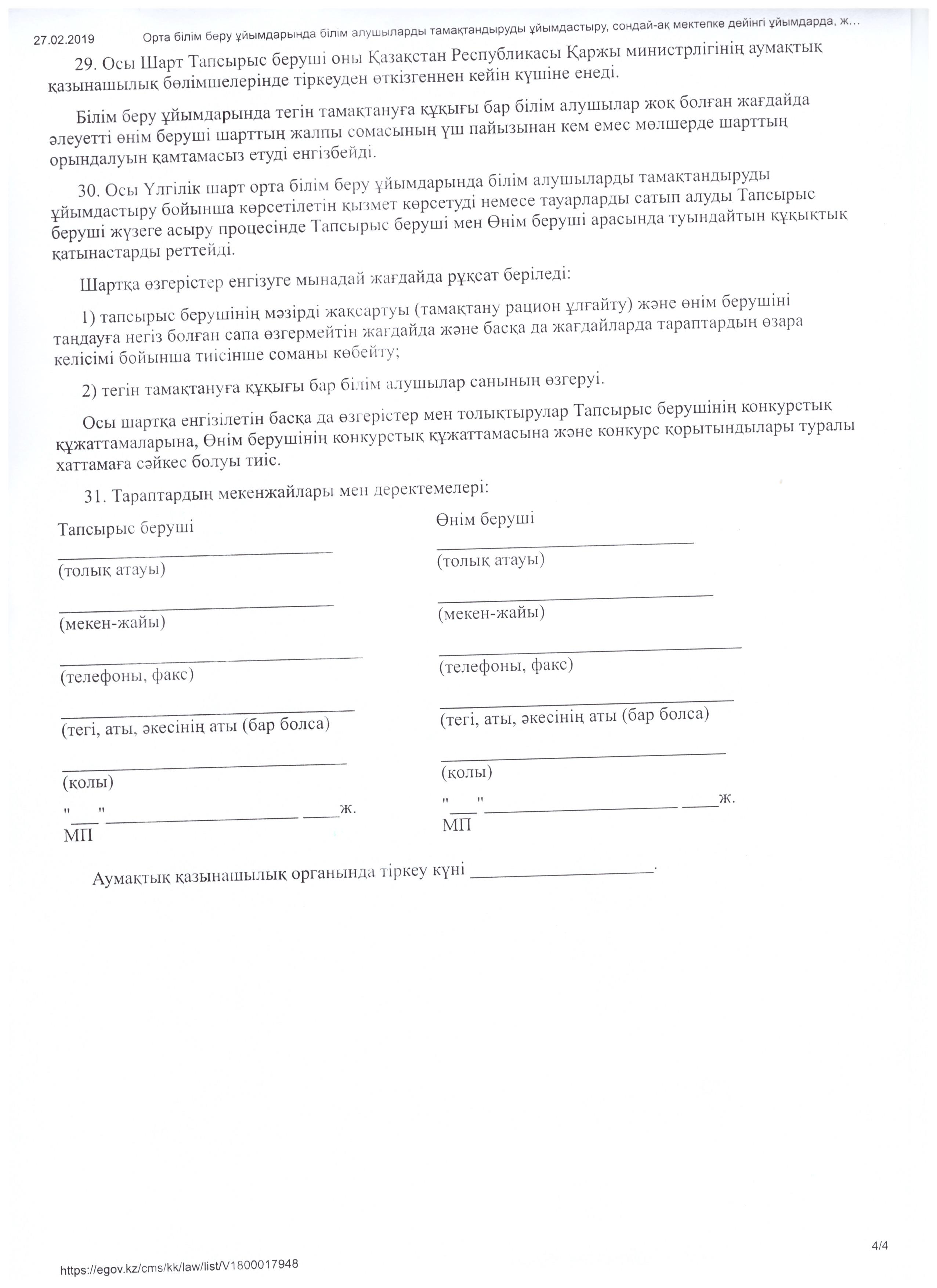 Бүгінгі күнге орта білім беру ұйымдарында білім алушыларды тамақтандыруды, мектепке дейінгі ұйымдарында, жетім балалар мен ата-анасының қамқорлығынсыз қалған балаларға арналған білім беру ұйымдарында тәрбиеленетін және білім алатын балаларды тамақтандырумен қамтамасыз етуге байланысты тауарларды сатып алу тәртібі әзірленген (ҚР БҒМ 2018 ж. 31 қазандағы № 598 бұйрығы).
