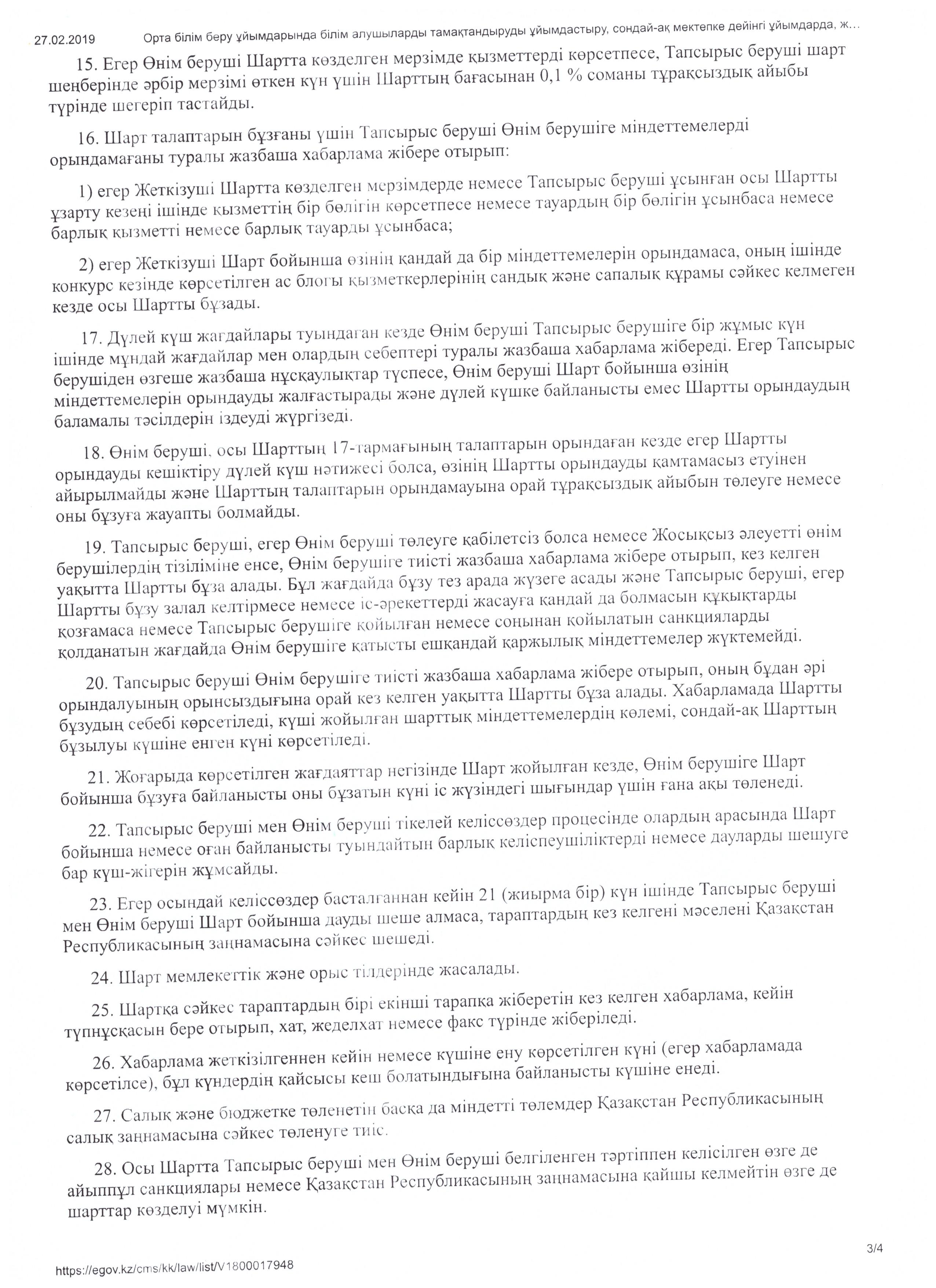 Өнім беруші шарттың талаптарын бұзған немесе тиісінше орындамаған жағдайда шарт сот тәртібінде бұзылады және осы өнім беруші жозықсыз деп танылады(ҚР БҒМ 2018 ж. 31 қазандағы № 599 бұйрығы).