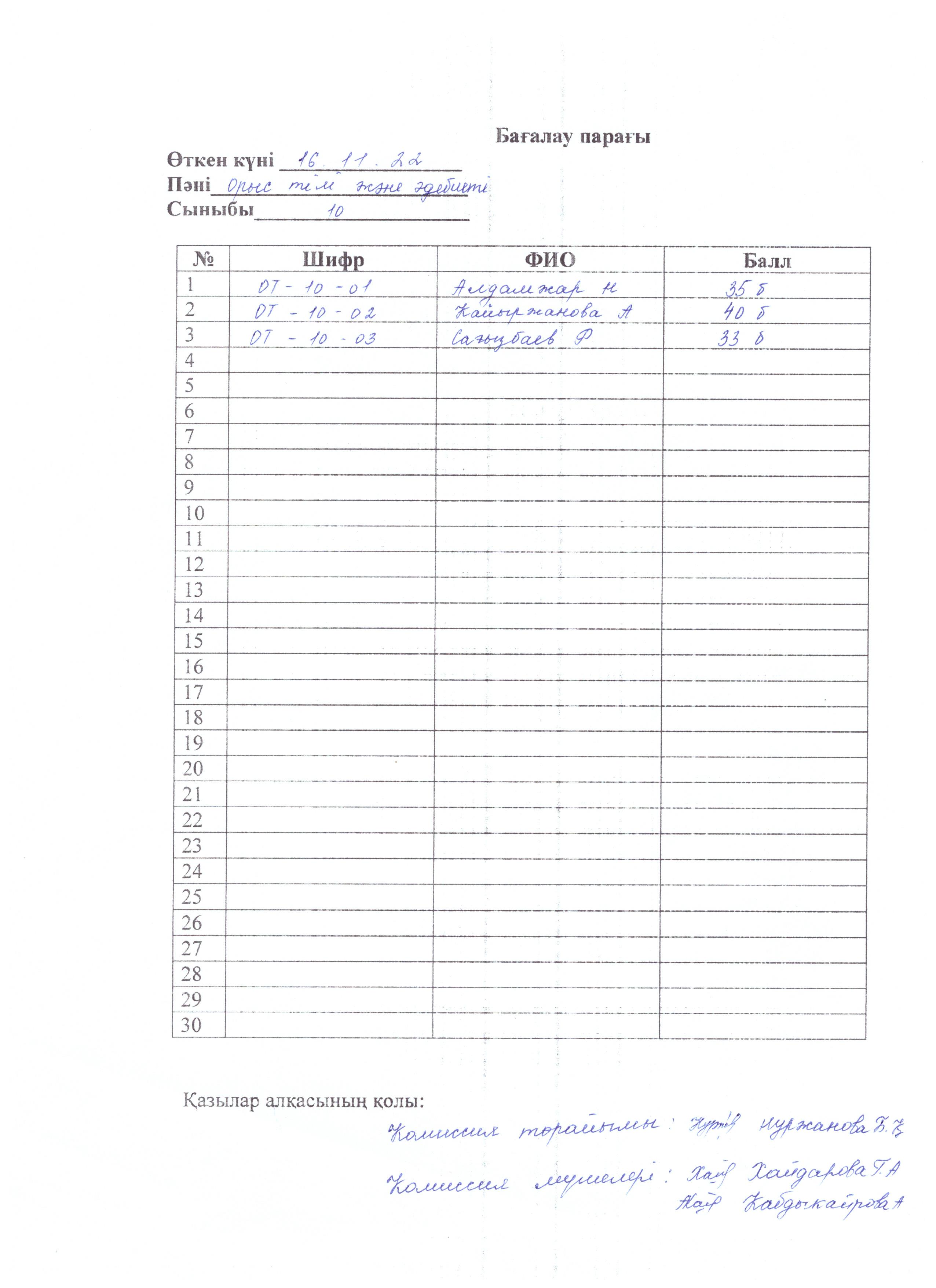 Бағалау парағы 10 сынып