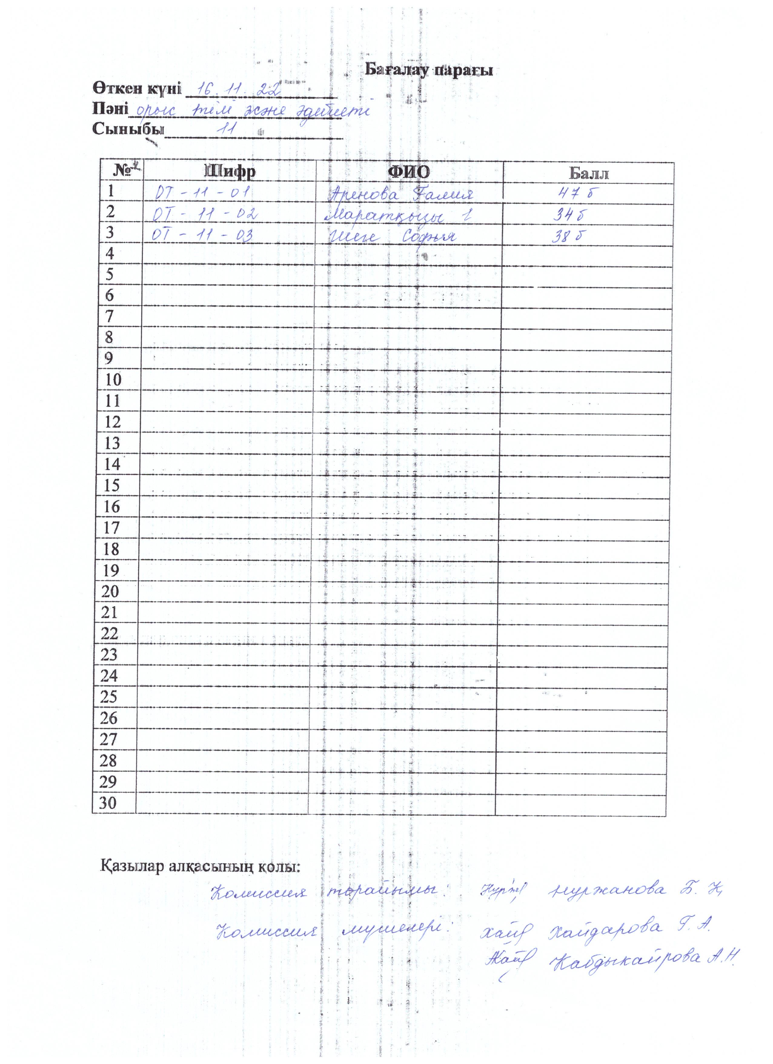 Бағалау парағы 11 сынып