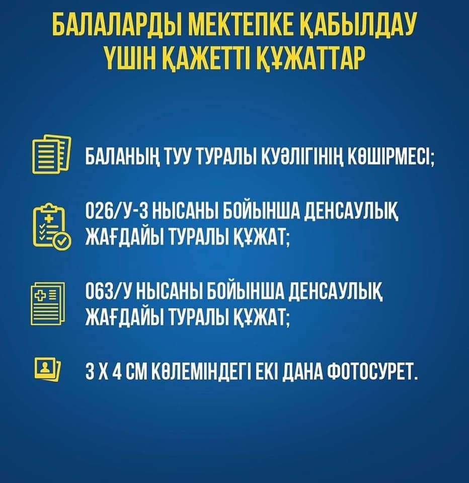 📚Бірінші сыныпқа балалардың құжаттарын қабылдау 1 сәуірде басталады. Мектепке алты жасар балалар мен ағымдағы жылы 6 жасқа толатын балалар қабылданады.