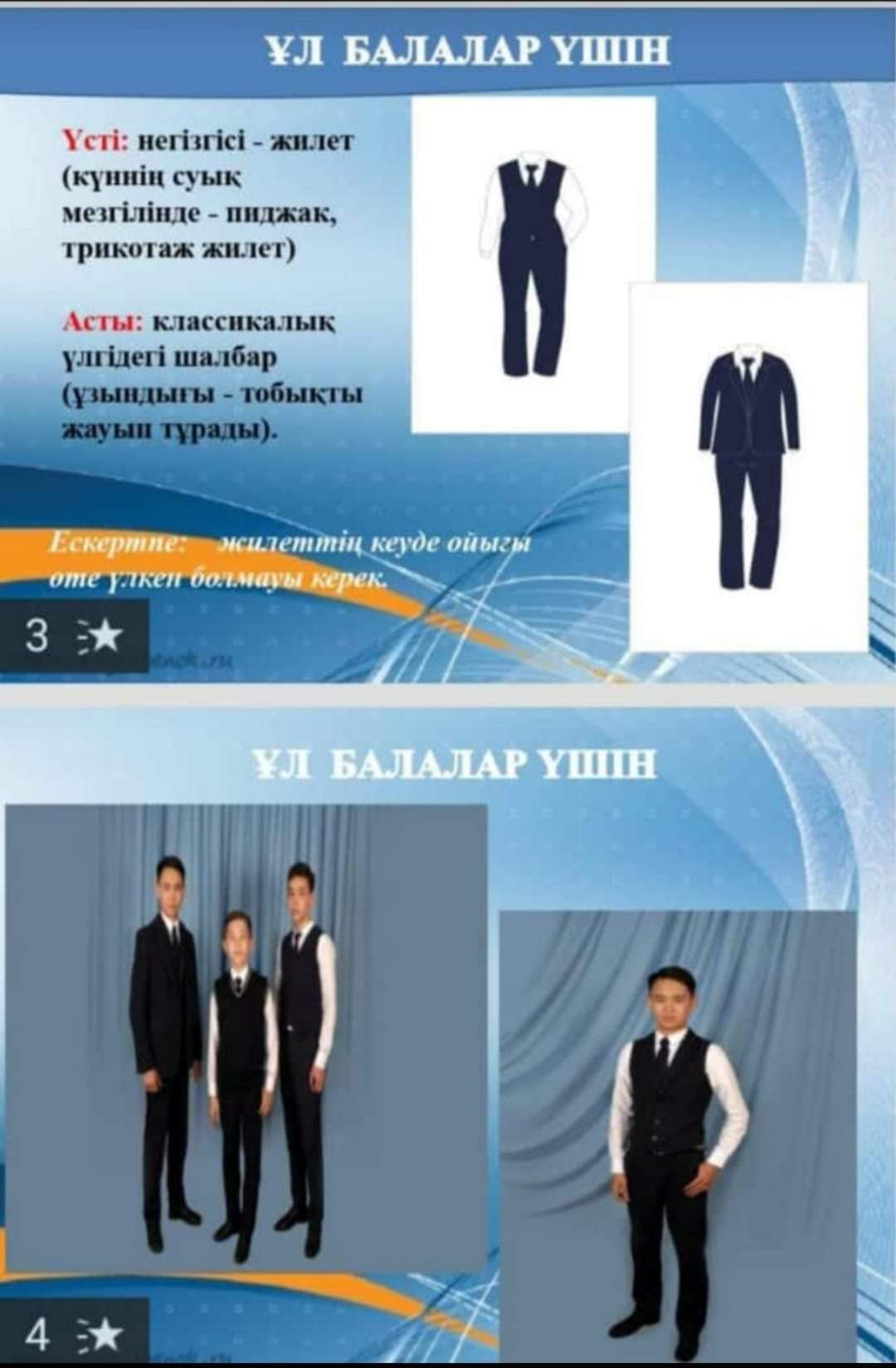2. Ұлдардың мектеп формасы: пиджак, жилет, шалбар, ақ жейде. Ұлдарға арналға шалбарлар кең тігілген және ұзындығы тобықты жауып тұруы керек. Аяқ киім классикалық үлгіде болуы міндетті.