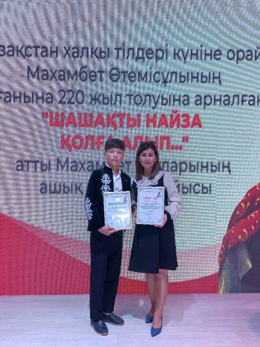 Қазақстан халықтарының тілдері күніне орай, Махамбет Өтемісұлының 220 жылдығына арналған "Шашақты найза қолға алып..." атты Махамбет оқуларының сайысында мектебіміздің 9-сынып оқушысы Жұмагерейұлы Рахим ақын өлеңдерін жатқа оқып, Алғыс хатқа ие болды.