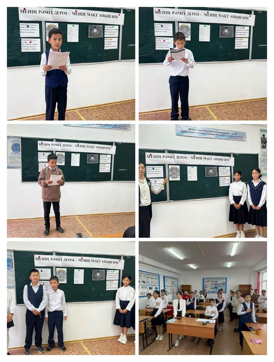 Жалпы білім беретін 25 Б.Момышұлы атындағы орта мектебінде "Менің рәміздерім- менің мақтанышым" апталығының іс-шаралар жоспарына сәйкес, оқушылармен "Мемлекеттік рәміздер-ел мәртебесі" тақырыбында өткізілген сынып сағаттары.